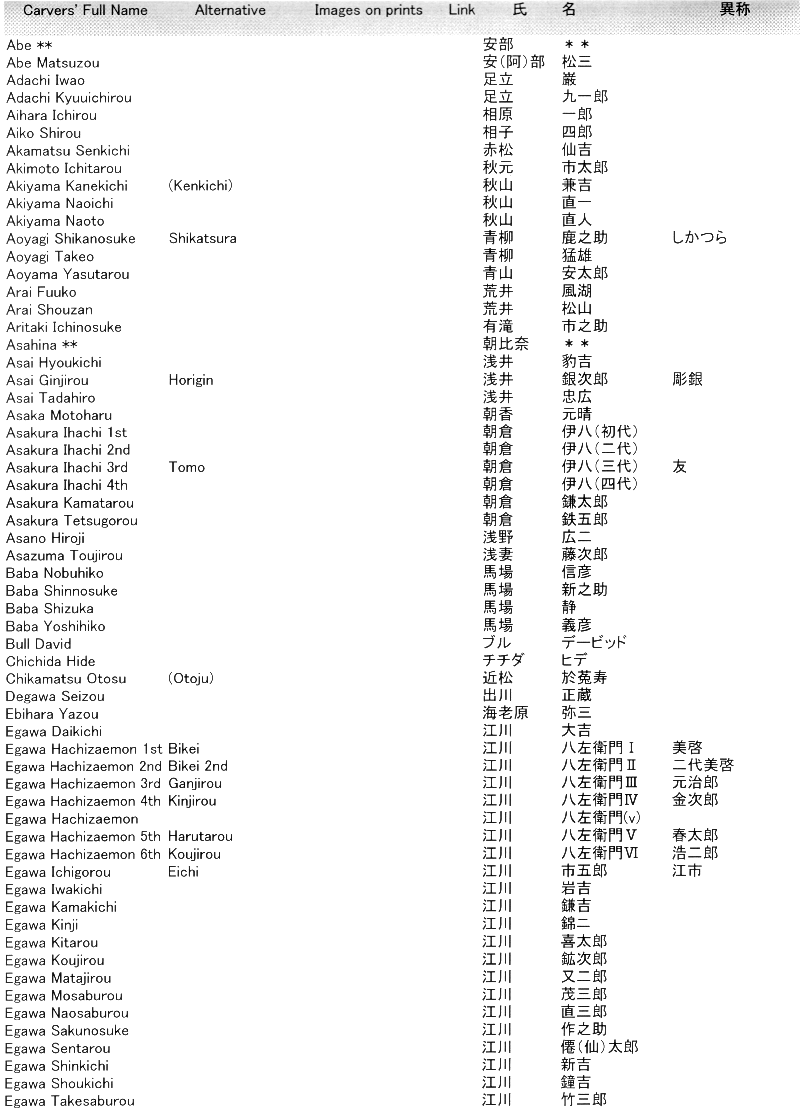 The two central columns show the family and given names. Most are written in full Kanji, but some are written in the distinctive styles of Katakana and Hiragana where appropriate. We have provided such alternates to help collectors identify actual seals that may be encountered on shin hanga prints. Click here for a larger, clearer version of this page.