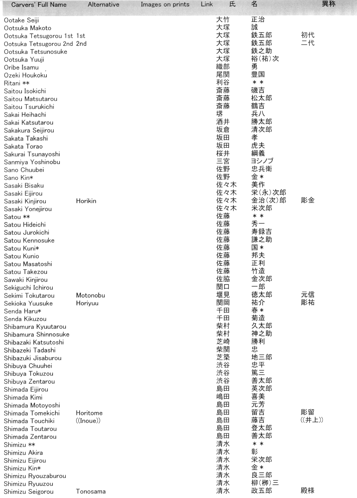 The two central columns show the family and given names. Most are written in full Kanji, but some are written in the distinctive styles of Katakana and Hiragana where appropriate. We have provided such alternates to help collectors identify actual seals that may be encountered on shin hanga prints. Click here for a smaller, faster-loading version of this page.