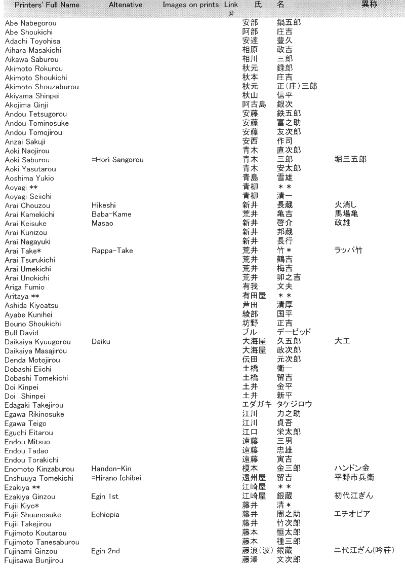 The two central columns show the family and given names. Most are written in full Kanji, but some are written in the distinctive styles of Katakana and Hiragana where appropriate. We have provided such alternates to help collectors identify actual seals that may be encountered on shin hanga prints. Click here for a larger, clearer version of this page.