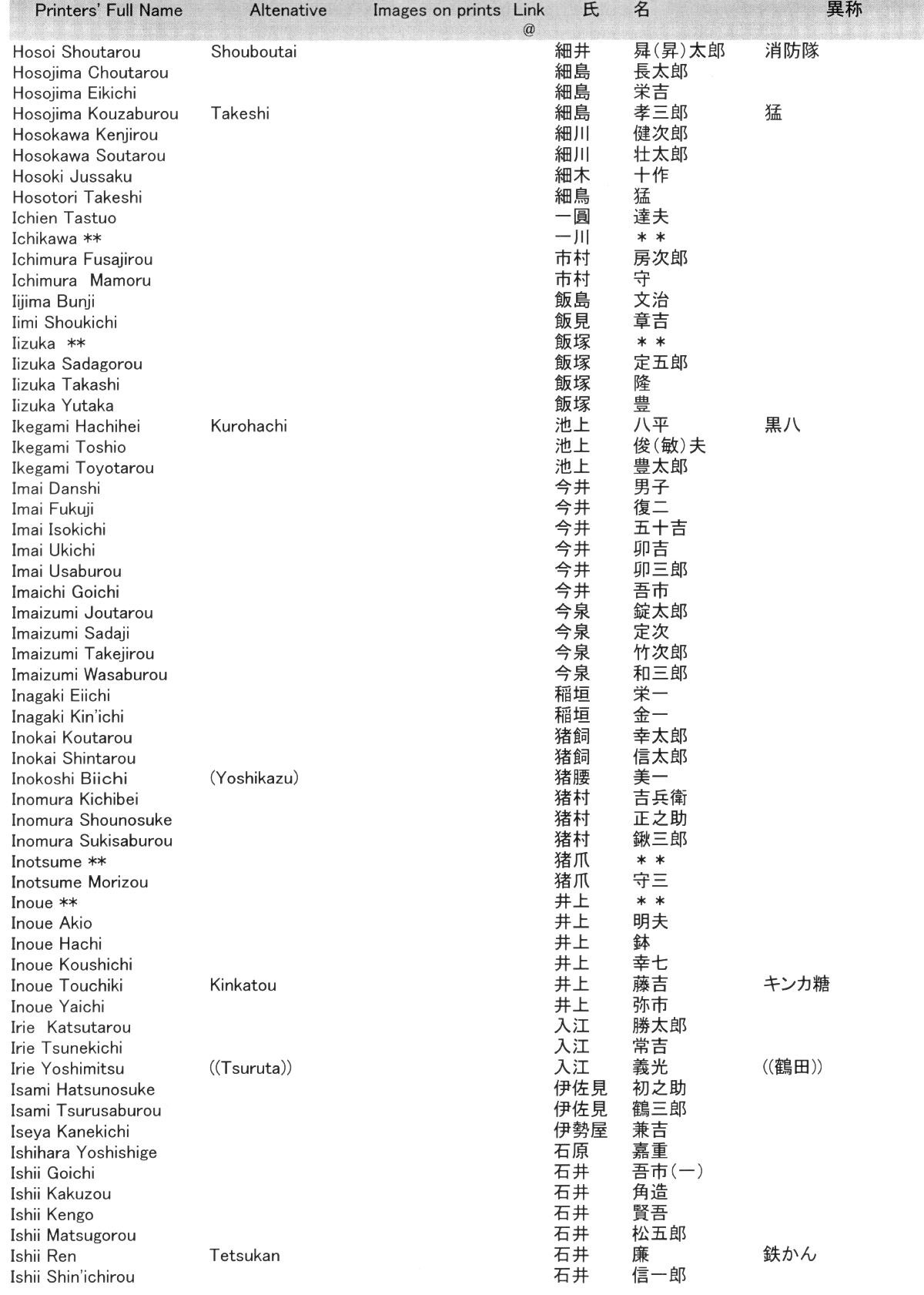 The two central columns show the family and given names. Most are written in full Kanji, but some are written in the distinctive styles of Katakana and Hiragana where appropriate. We have provided such alternates to help collectors identify actual seals that may be encountered on shin hanga prints. Click here for a smaller, faster-loading version of this page.