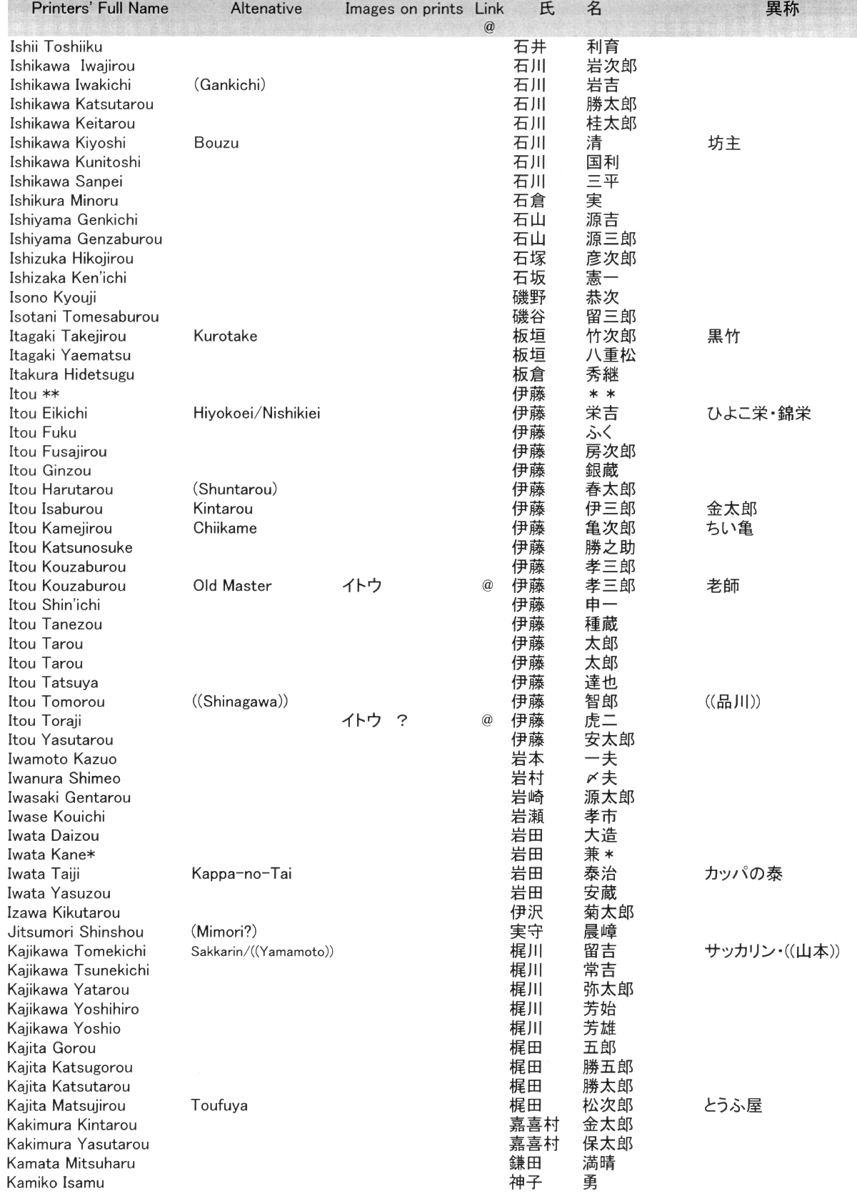 The two central columns show the family and given names. Most are written in full Kanji, but some are written in the distinctive styles of Katakana and Hiragana where appropriate. We have provided such alternates to help collectors identify actual seals that may be encountered on shin hanga prints. Click here for a smaller, faster-loading version of this page.