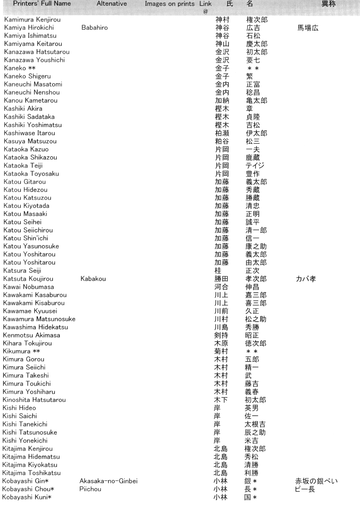 The two central columns show the family and given names. Most are written in full Kanji, but some are written in the distinctive styles of Katakana and Hiragana where appropriate. We have provided such alternates to help collectors identify actual seals that may be encountered on shin hanga prints. Click here for a smaller, faster-loading version of this page.