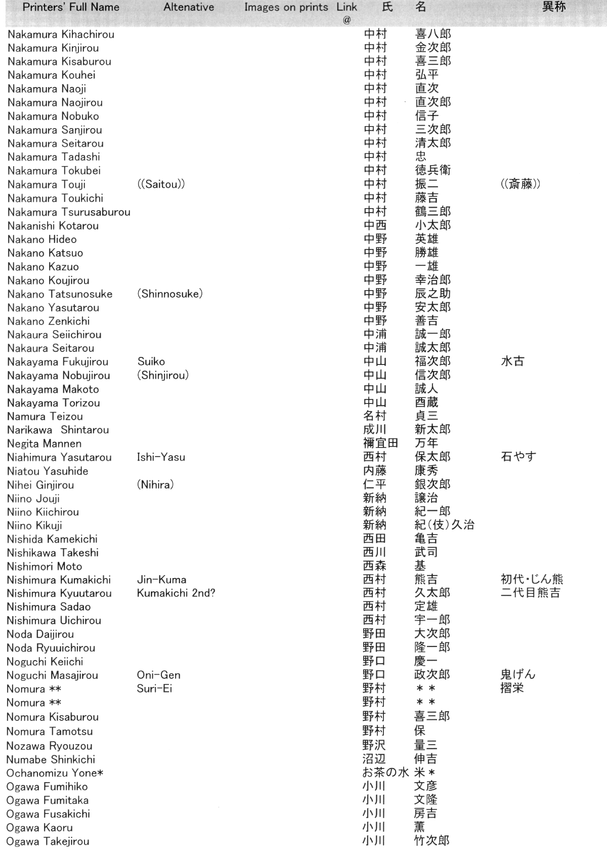 The two central columns show the family and given names. Most are written in full Kanji, but some are written in the distinctive styles of Katakana and Hiragana where appropriate. We have provided such alternates to help collectors identify actual seals that may be encountered on shin hanga prints. Click here for a smaller, faster-loading version of this page.