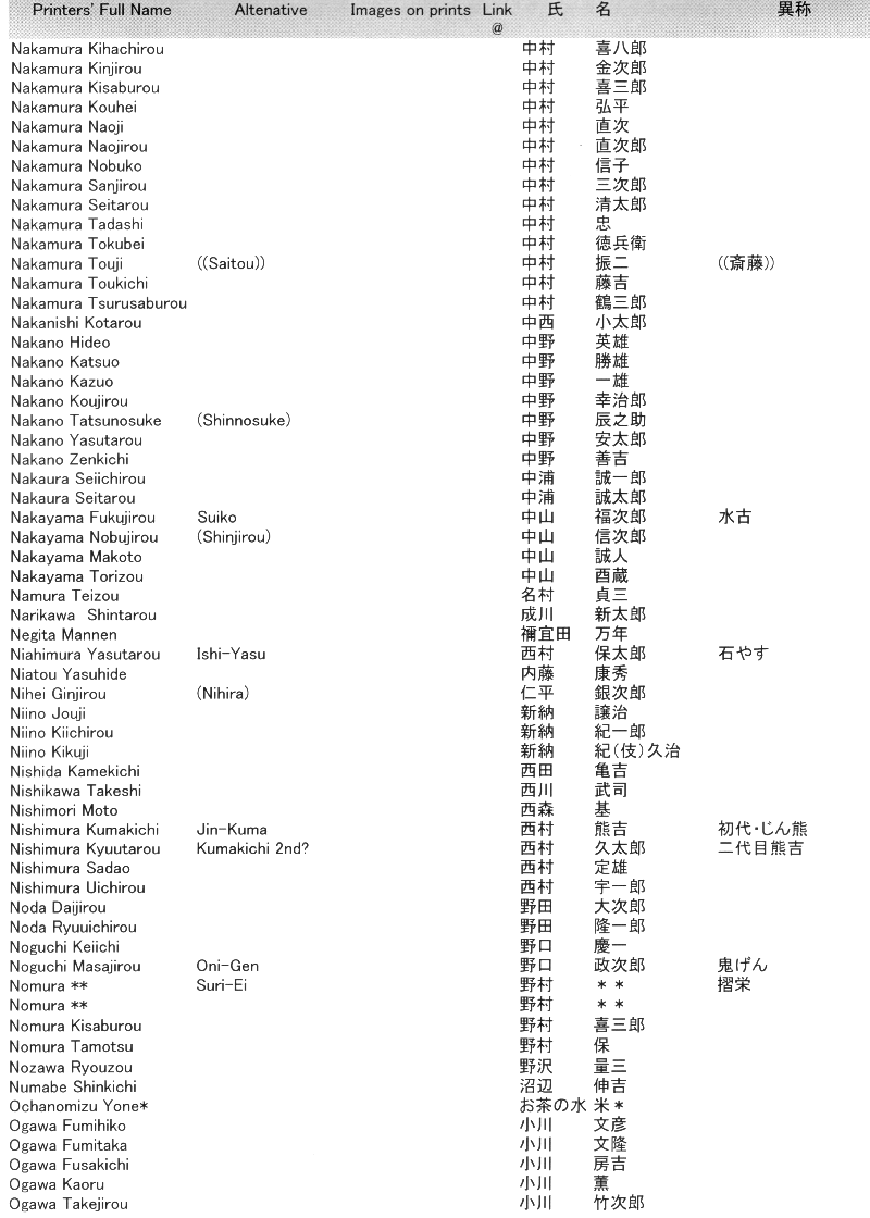 The two central columns show the family and given names. Most are written in full Kanji, but some are written in the distinctive styles of Katakana and Hiragana where appropriate. We have provided such alternates to help collectors identify actual seals that may be encountered on shin hanga prints. Click here for a larger, clearer version of this page.