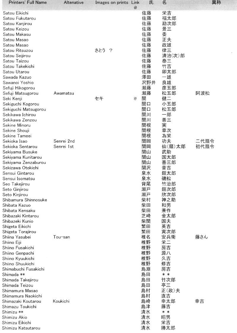 The two central columns show the family and given names. Most are written in full Kanji, but some are written in the distinctive styles of Katakana and Hiragana where appropriate. We have provided such alternates to help collectors identify actual seals that may be encountered on shin hanga prints. Click here for a larger, clearer version of this page.