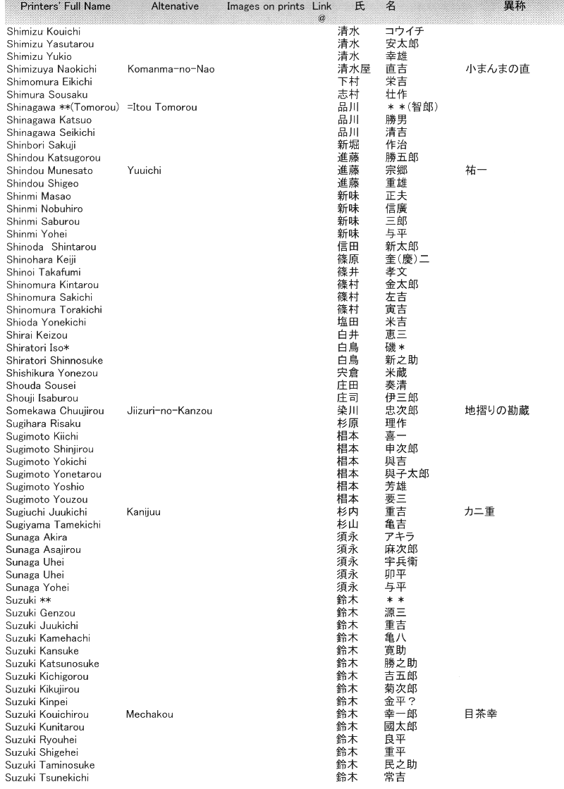 The two central columns show the family and given names. Most are written in full Kanji, but some are written in the distinctive styles of Katakana and Hiragana where appropriate. We have provided such alternates to help collectors identify actual seals that may be encountered on shin hanga prints. Click here for a larger, clearer version of this page.