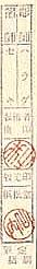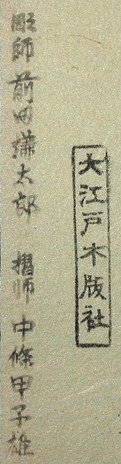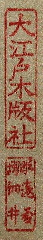 Little is known about the publisher Hanmoto Tokyo Do. Mrs. Doi has speculated that this seal was used occasionally by her husband's father Teiichi Doi in the 1930's. Members can also see a short piece about these seals. Oedo Mokuhansha, according to Mrs. Doi's recollection, was considered more a distributor than a publisher. Members: also see a small article about this company. Here are two more seals from Oedo Mokuhansha. Both are from Hiroshige reprints, which appear to have been produced in the late 1930's or immediately prewar.