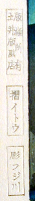 The upper rectangle contains the standard copyright statement -- it reads hanken shoyu Doi Teiichi. The contributor reports "it's kind of odd, that the same character is used here with apparently different pronunciation [ to and fuji ]. Also, I've never heard of the carver Fujikawa as a Doi employee. There is a Fujikawa Saburo who carved for Watanabe listed in Merritt/Yamada." Print D-1 of Narazaki's Hasui book appears to bear this Doi seal arrangement. The seals on print D-2 look the same too, but perhaps with double-wide printer/carver seals.