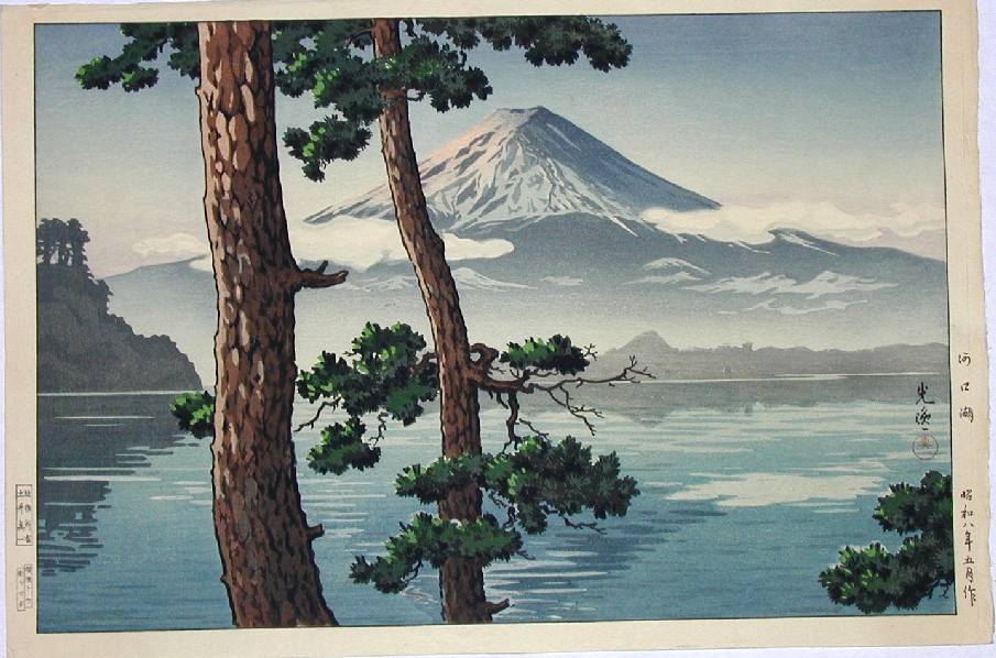From the top down, the seals are: Doi Hangaten, printer Ito, carver Ikeda (last syllable da in Kanji). These are from a Koitsu print of Mt. Fuji behind Lake
