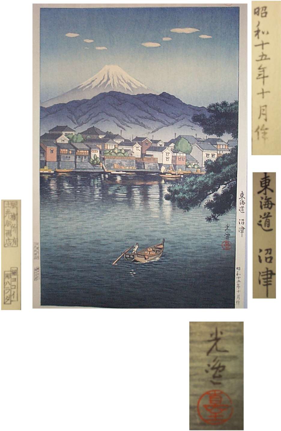 These seals are from a Koitsu print titled "Numazu" from the series "Tokaido". Its date is Showa 15, 10th month, or October 1940. It thus seems to be an an early edition, carved by Harada and printed by Yokoi. The publisher seal reads Doi Hangaten.