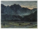 woodblock print 1950, 9.5" x 14.5" | The surreal blue used in the woodblock print greatly enhances this design, giving a sense of the mountains' coldness and majestic height. |